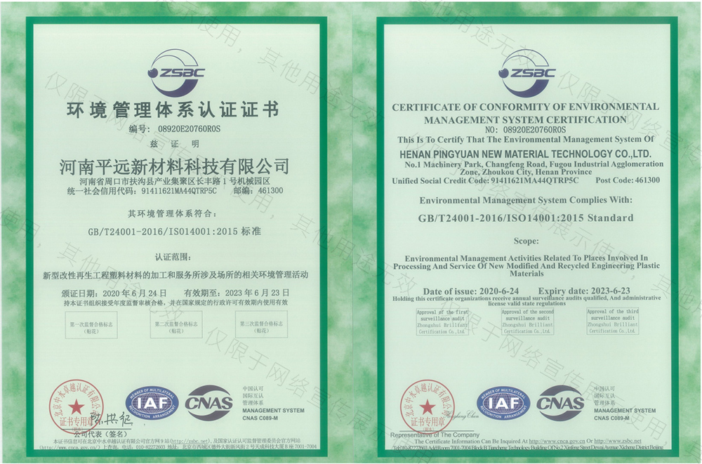 河南平遠(yuǎn)新材料科技有限公司生產(chǎn)基地坐落于河南省鄢陵縣先進(jìn)制造業(yè)開(kāi)發(fā)區(qū),工廠占地10000平方米。公司通過(guò)GRS全球回收標(biāo)準(zhǔn)認(rèn)證、ISO9001質(zhì)量體系、14001環(huán)境體系和45001職業(yè)健康安全管理體認(rèn)證。華東分公司位于浙江省余姚市中國(guó)塑料城。